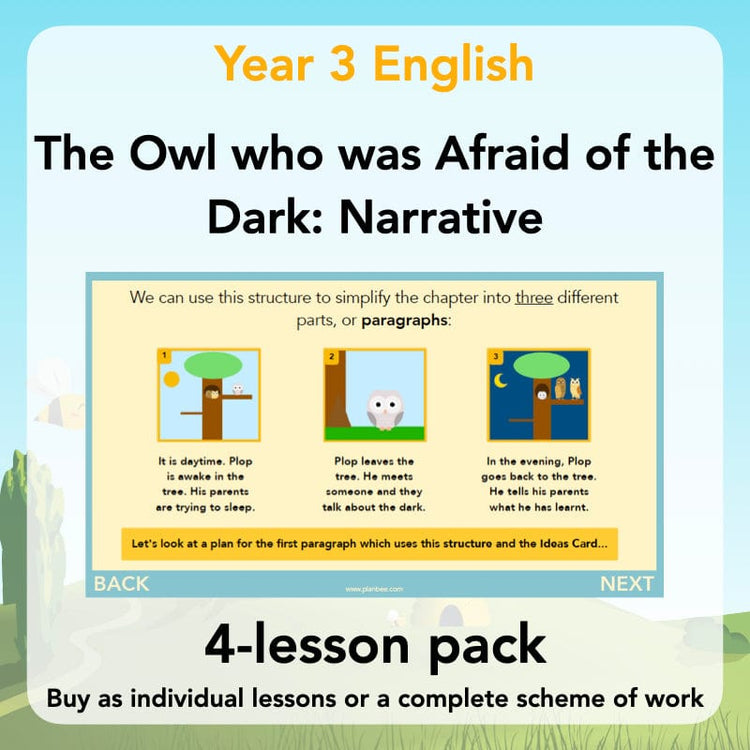 This set of four narrative writing Year 3 English lessons inspires your class to generate ideas for, plan and then write a new chapter for The Owl who was Afraid of the Dark! There is a lesson specifically focusing on direct speech, which the children are challenged to use in their writing. They will also explore the structure of the chapters in this classic children's story and use this to build their own chapter of the story.