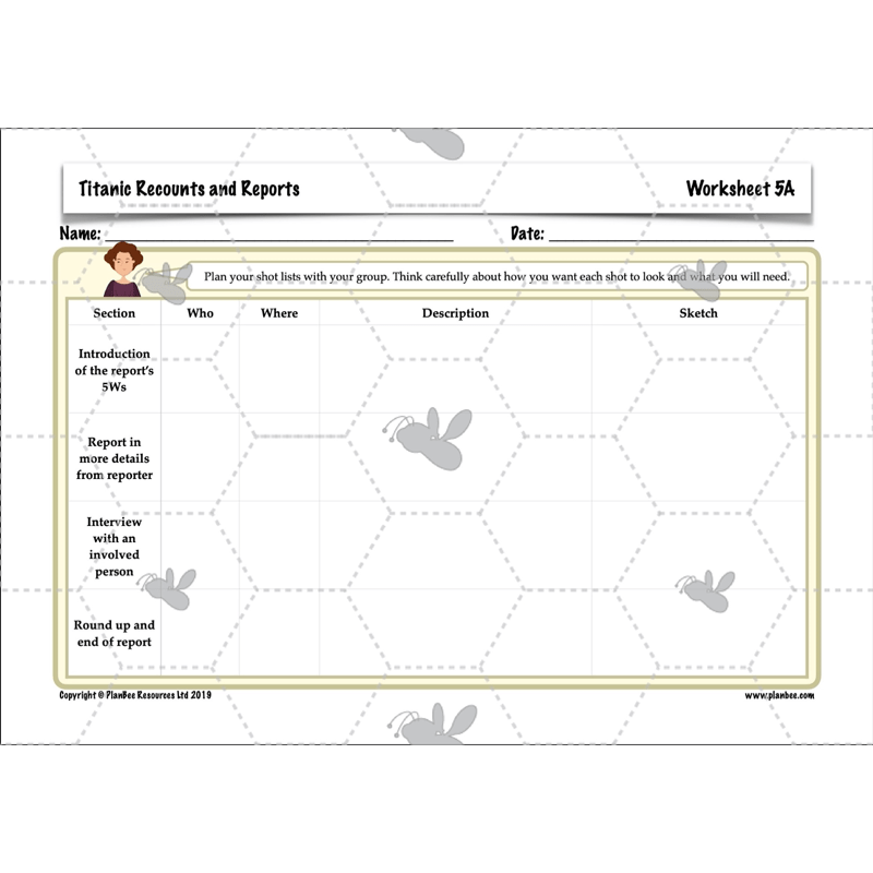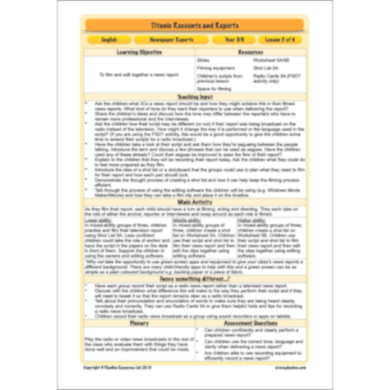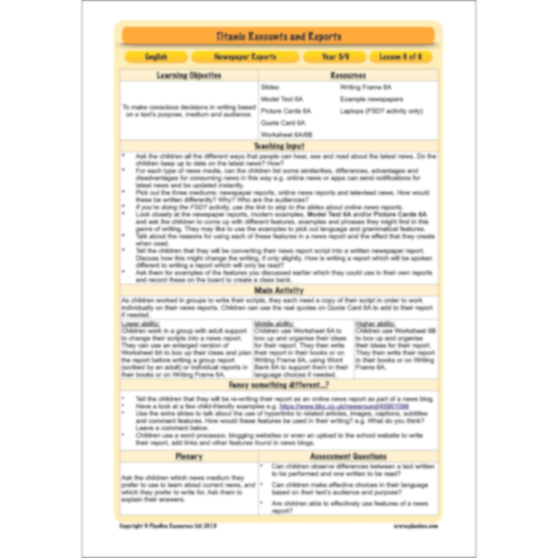 This ready-to-teach Titanic News Report lesson provides everything you need to challenge your class to create their own televised Titanic news reports, including a detailed lesson plan, a slideshow for the teaching input, differentiated activity ideas, and a range of printable resources to support your children as they write their scripts.