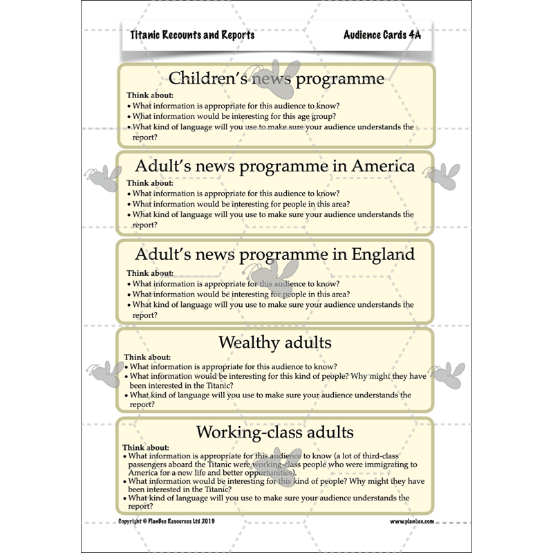 This Titanic Recounts and Reports planning pack for KS2 children challenges your Year 5 or Year 6 children to use what they know about the Titanic disaster to explore how different people would have reacted to the disaster. Your class will put themselves in a passenger’s shoes as they write a recount of the character’s experiences aboard the Titanic, as well as investigate how the public may have reacted when they heard the terrible news of the disaster through a newspaper report.
