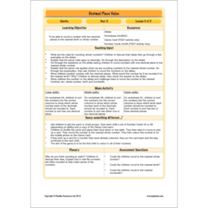 Help your children understand the number system better with this series of 'Decimal Place Value' lessons for Year 6. They will recap what the value of each digit in numbers up to ten million represent, as well as the value of digits in numbers with up to three decimal places. Once this is established, they will learn to order, round and use decimals through a variety of activities and games.