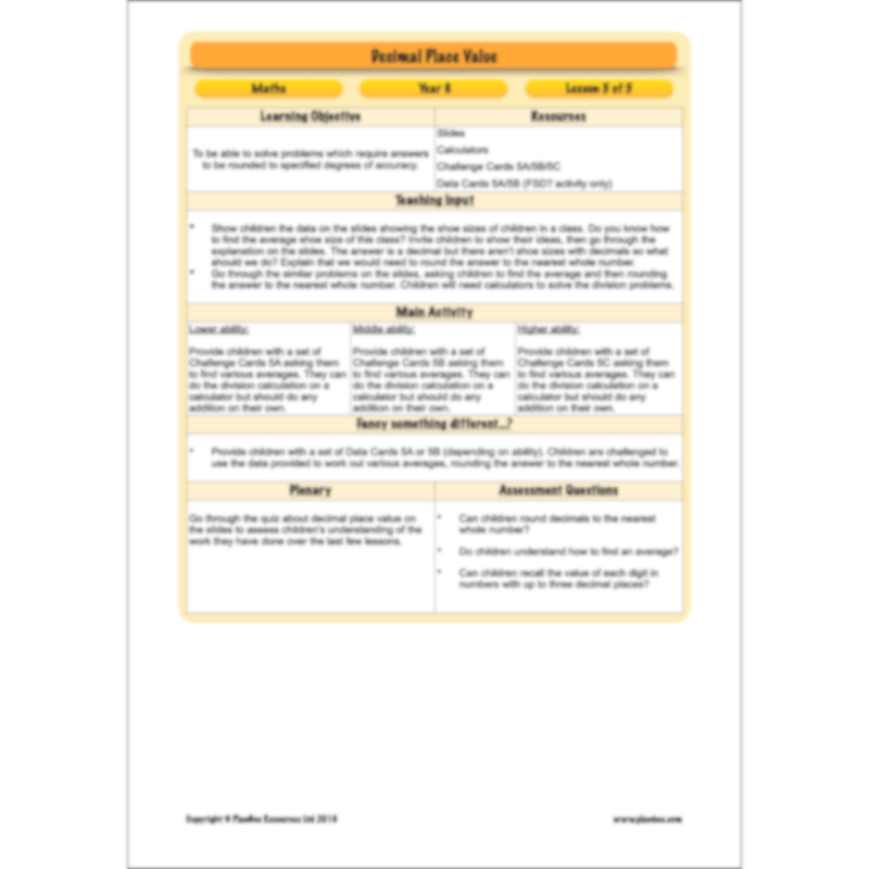 The final lesson in this series puts rounding decimals into real-life contexts in this lesson as they apply a variety of maths skills to find averages, rounding the answer to the nearest tenth or whole number when needed. The slides go through simple examples of how to do this, using calculators to support their calculations, before challenging children to gather and interpret their own data in the same way during their independent learning. There are also sets of data ready to be analysed in the alternative activity.