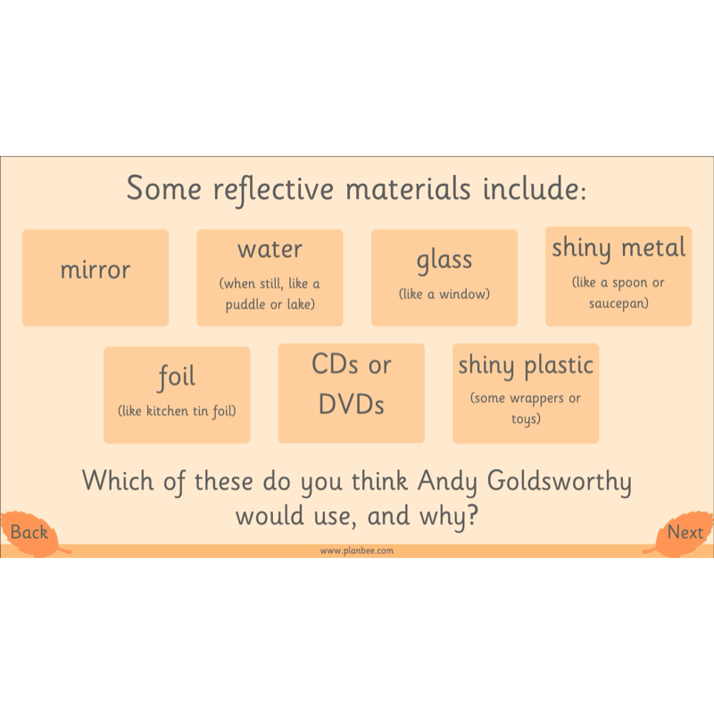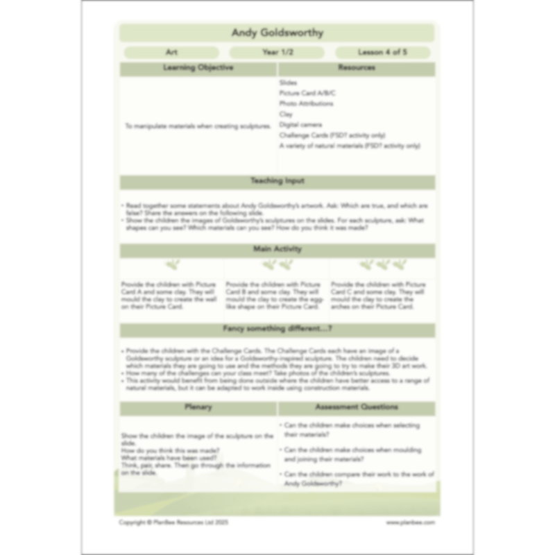 With detailed lesson plans, slides, activity ideas, differentiated activities and more, there is bound to be something to suit every little artist and have them creating their own Andy Goldsworthy-inspired masterpieces in no time!