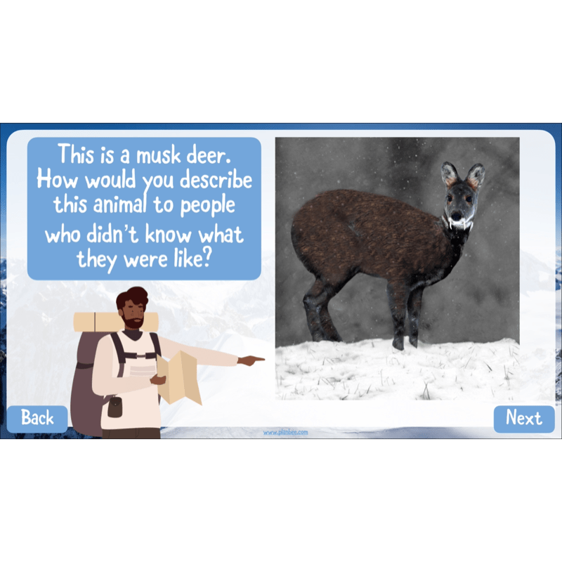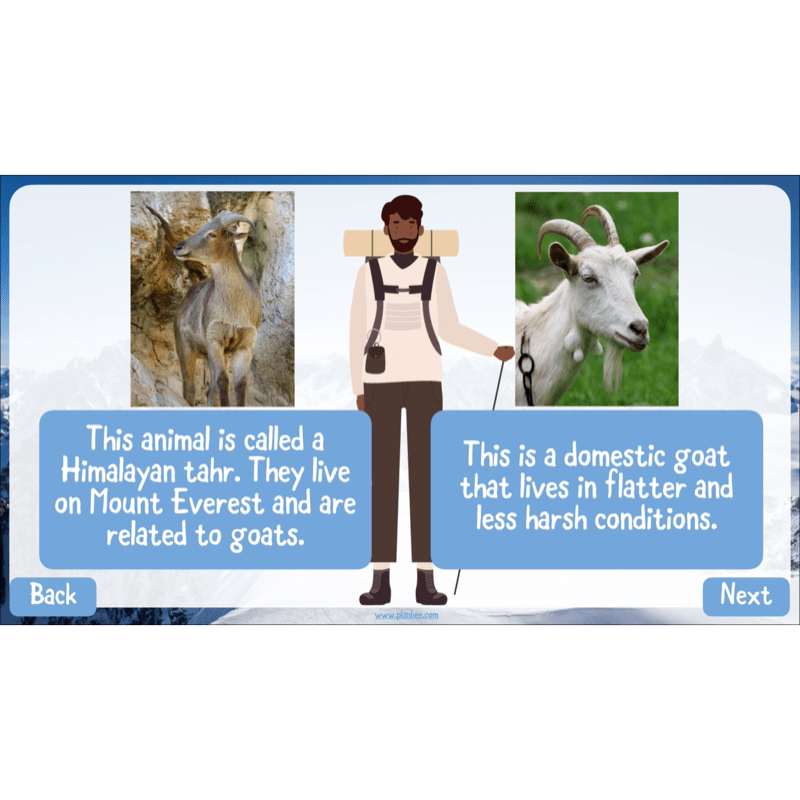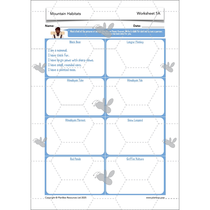 Each lesson is carefully designed to build scientific knowledge and vocabulary while encouraging enquiry, observation and discussion. Children will learn how energy flows through food webs, classify animals using branching databases, and discover the fascinating adaptations that help wildlife survive the cold, wind and high altitudes. They'll go on to explore how mountain environments affect animal life cycles and end the unit by identifying creatures specially suited to living on the highest peaks on Earth.