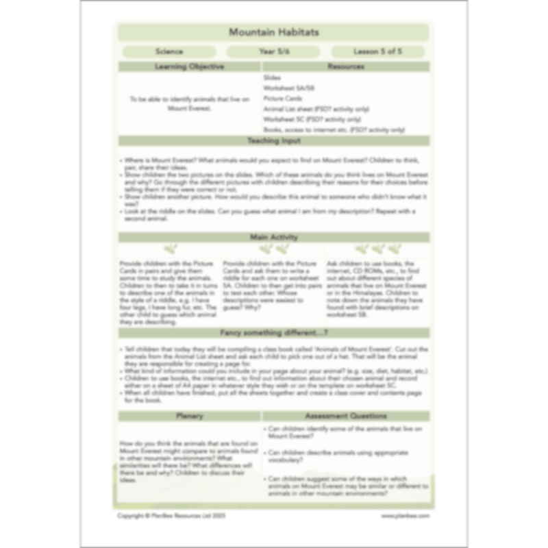 With detailed planning, differentiated activities, slides, worksheets, and optional 'Fancy Something Different…?' challenges, this pack provides everything you need to deliver a rich, cross-curricular topic that connects science and geography. Whether used as a standalone unit or part of a wider study on habitats or adaptation, Mountain Habitats will inspire curiosity and wonder in even your most reluctant learners.