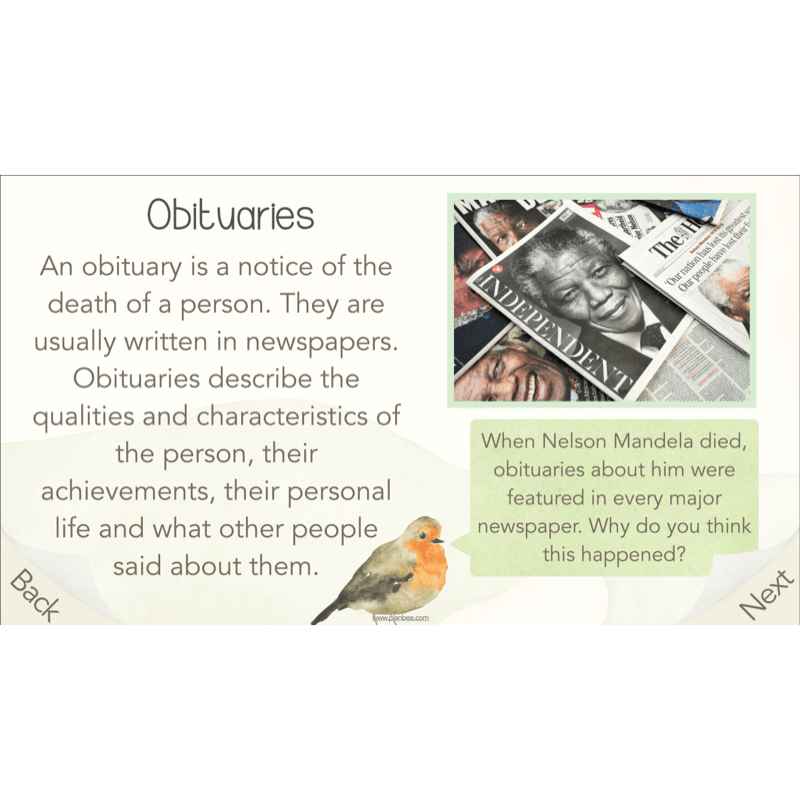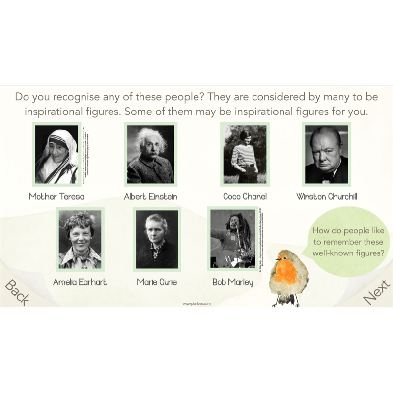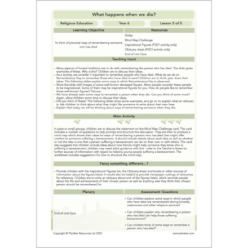 Children will consider how funeral rituals and memorial services help people to remember someone who has died, before going on to consider other ways of remembering a person which would help comfort loved ones suffering a bereavement. They will also learn about some of the ways in which inspirational figures are remembered.
