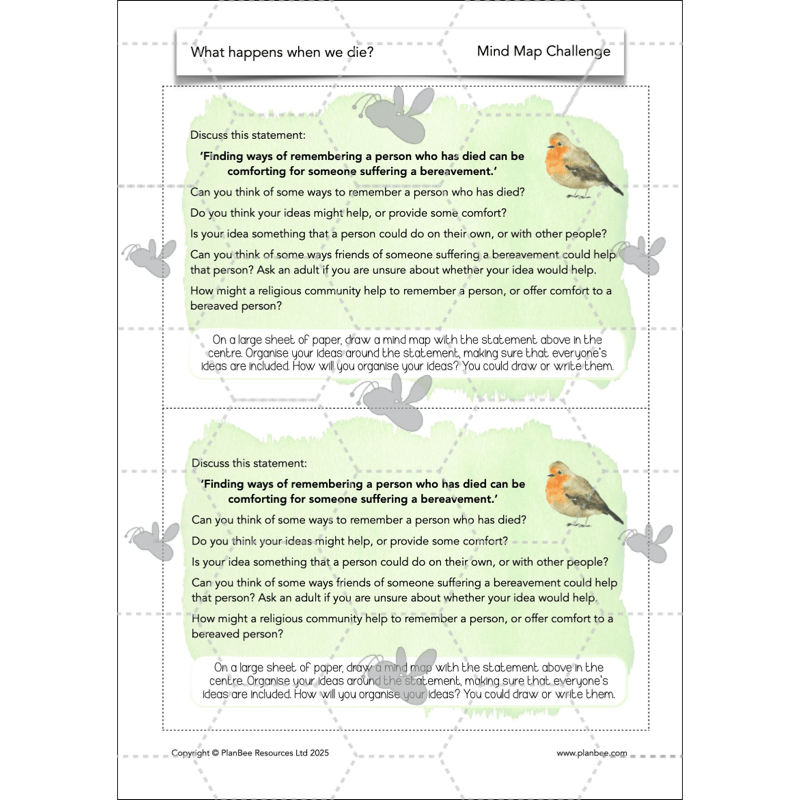 Children will learn about the beliefs of some religions with regard to what happens when a person dies, as well as having the opportunity to share their own beliefs, prior knowledge and experiences as members of religious or non-religious groups and communities.