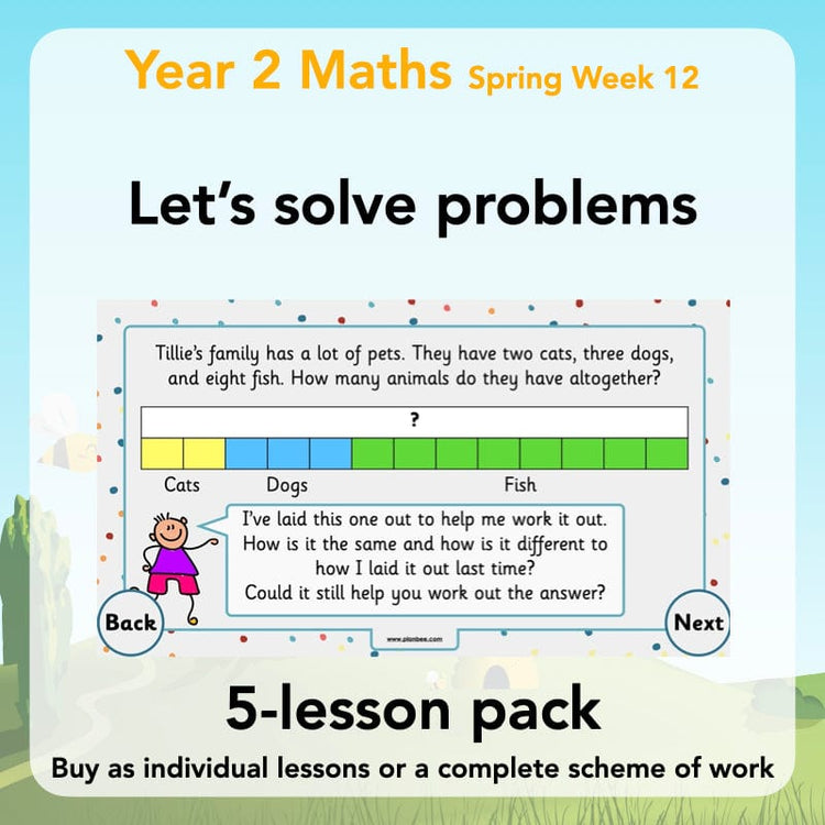 This lesson is the third of five in 'Let's Solve Problems' – a complete Maths scheme of work for Year 2. As with all of the lessons in this unit, it includes detailed planning, a choice of differentiated activities, slides, worksheets and other printable PDF resources to accompany the activities.