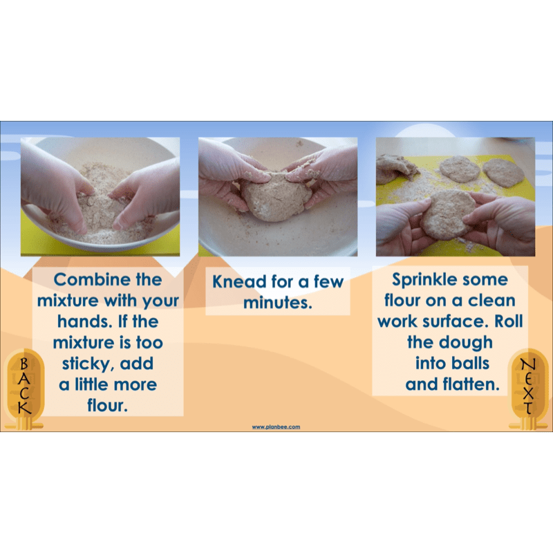 As a class, they will look at a recipe for making Egyptian bread. The included slideshow presentation for the teaching input goes through some simple step-by-step instructions, complete with photos, to show children how to follow an ancient Egyptian bread recipe to make their own delicious flatbreads. They can even add their own twist to the recipe if they're feeling adventurous!