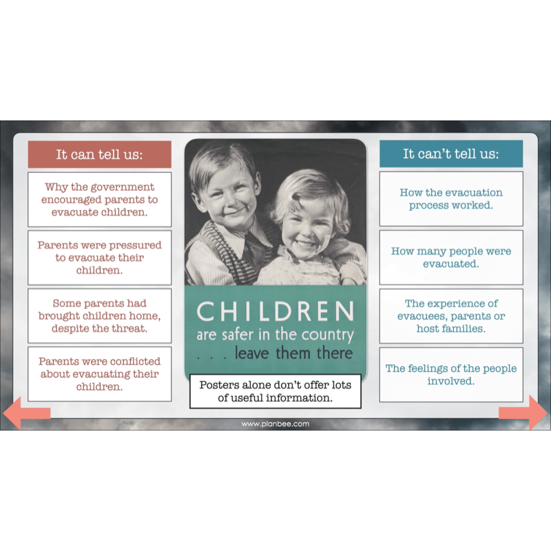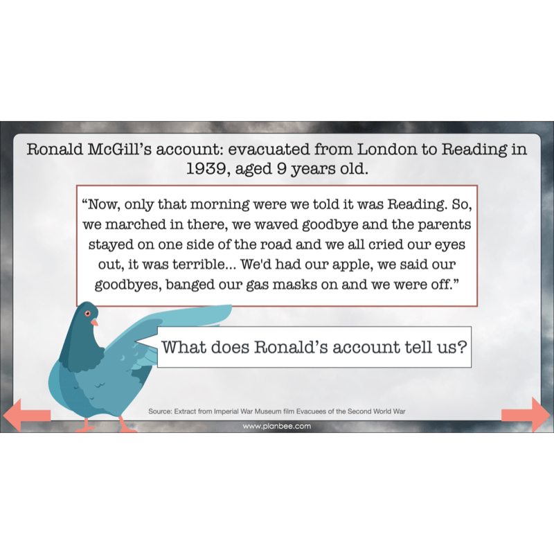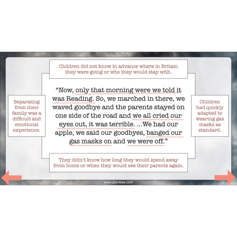 Through the use of carefully chosen and modelled examples, children will learn how to analyse oral testimonies. Once confident, children will analyse a range of oral testimonies from evacuees, parents and host families to investigate people’s different experiences of evacuation.