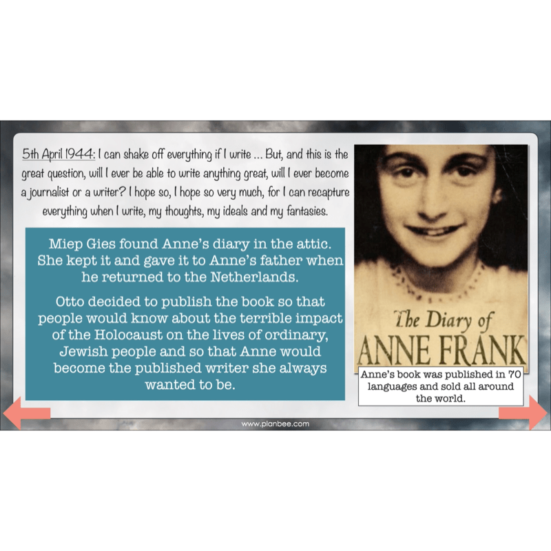 Children learn the story of Anne Frank and use extracts from her diary to understand the impact of the Holocaust on the Jewish people.