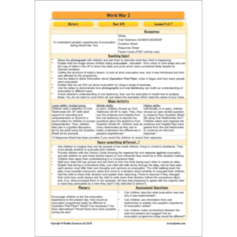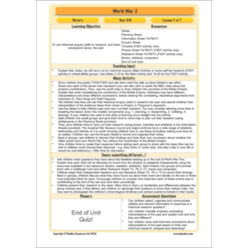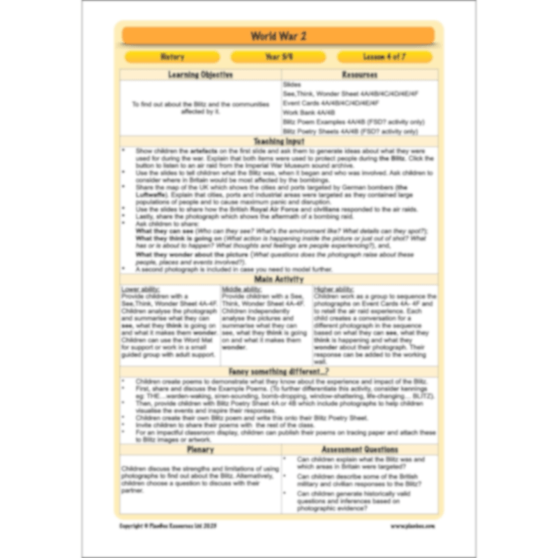 Each ready-to-teach KS2 WW2 History lesson contains a detailed lesson plan with differentiated activities, an engaging slideshow and printable resources to support the children's learning.