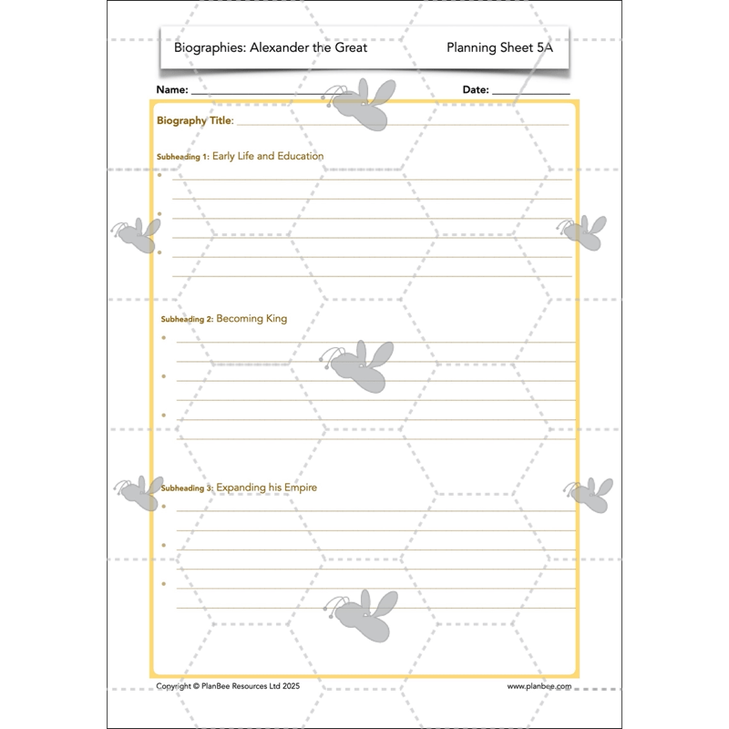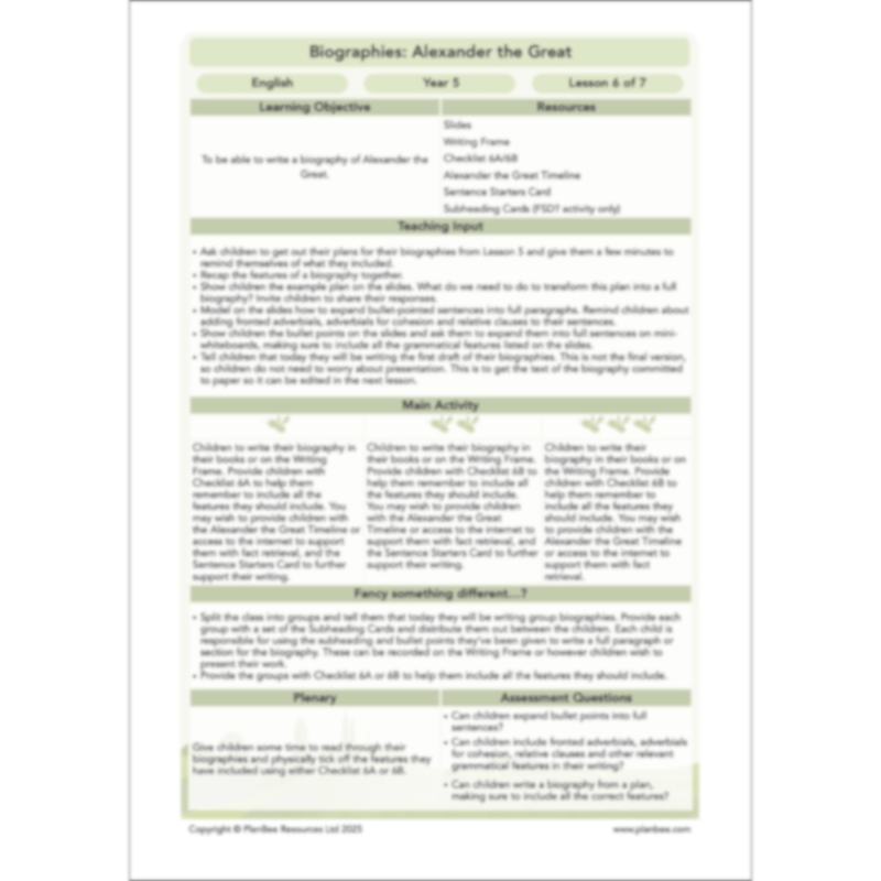 This Alexander the Great KS2 English scheme of work challenges your Year 5 children to learn about one of the greatest military leaders in history and use what they learn to write their own biographies about him. Through a series of carefully constructed lessons that build knowledge and understanding, your KS2 class will explore the features of a biography, learn about Alexander the Great's life, achievements and legacy, then put it all together in a final piece of writing.