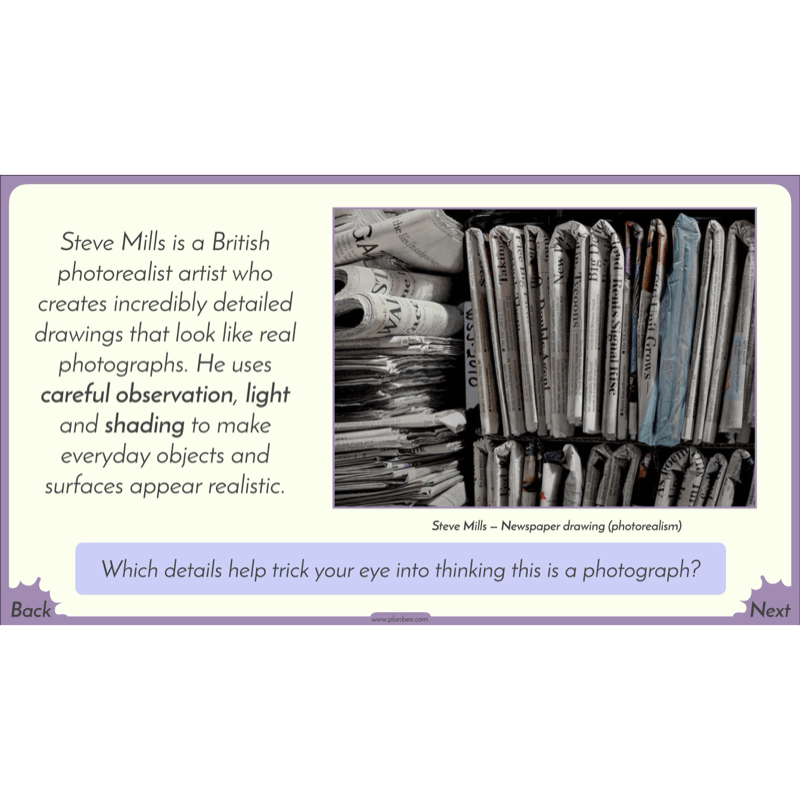 Through discussion and visual examples, children learn how artists use light and shadow to make flat images appear realistic and three-dimensional, before being introduced to photorealism as a modern way of creating the illusion of reality. Children then apply this learning in their independent work by carefully using shading to try to trick the viewer’s eye and create a realistic effect in their own drawings.