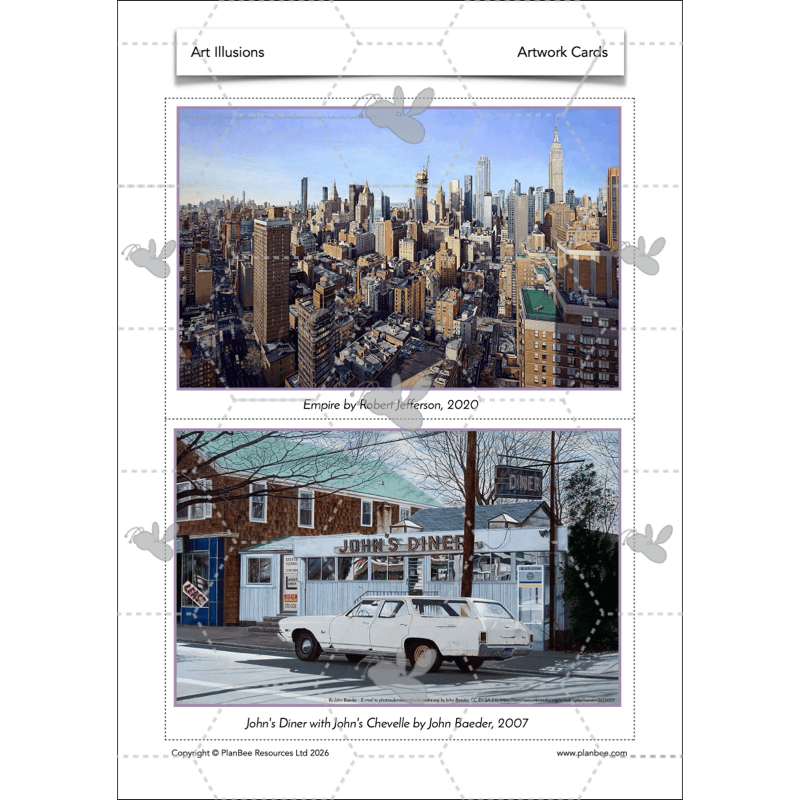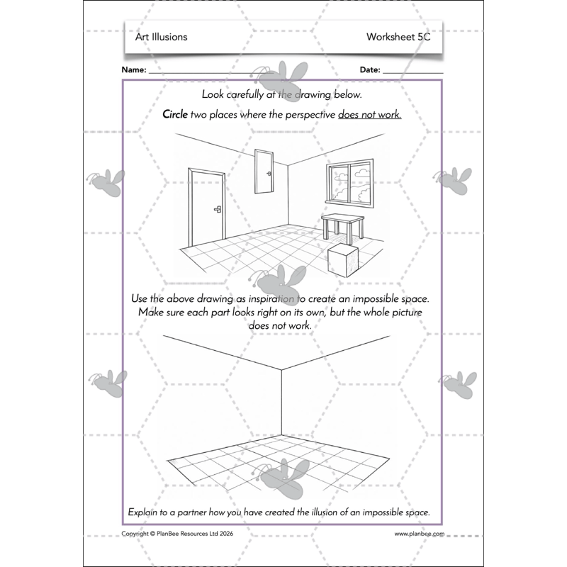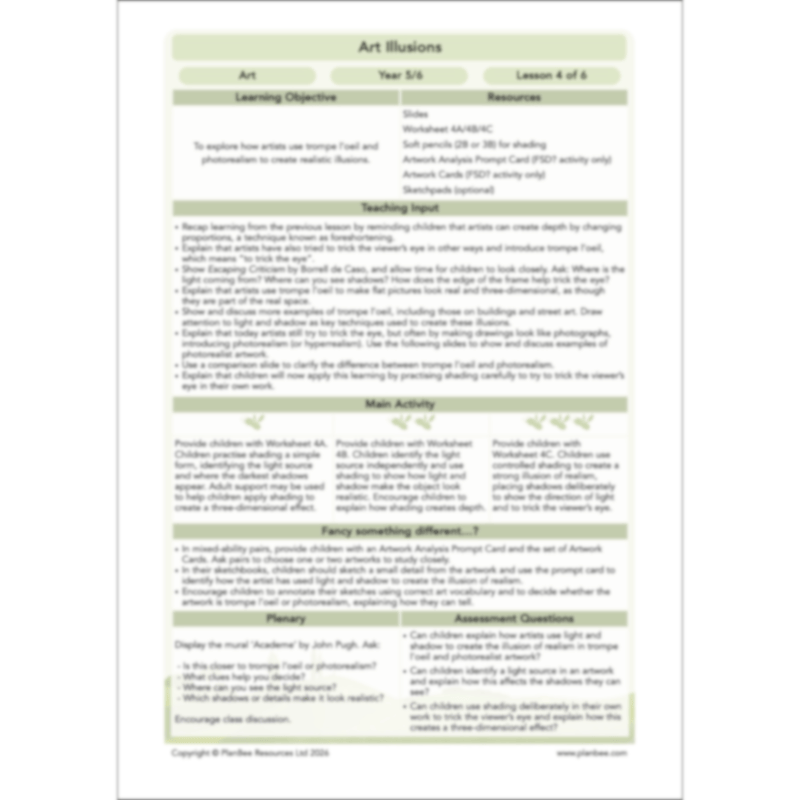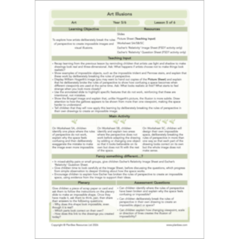 Art Illusions KS2 is a six-lesson art scheme that introduces children to illusion and perspective through practical, drawing-focused activities. Children explore how artists create depth, distance and movement by working with outdoor and interior perspective, foreshortening, trompe l’oeil, impossible shapes and optical art. Through step-by-step modelling, discussion and independent practice, children develop key techniques such as vanishing points, horizon lines and construction lines, applying these skills to create imaginative and realistic artwork.
