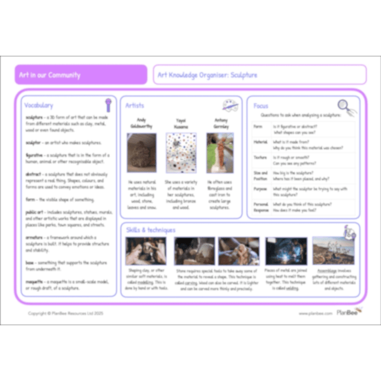 This downloadable Sculpture KS2 pack includes everything you need for a successful lesson: a detailed plan, a set of informative PDF slides for the teaching input, and resources to support your class with their independent learning.