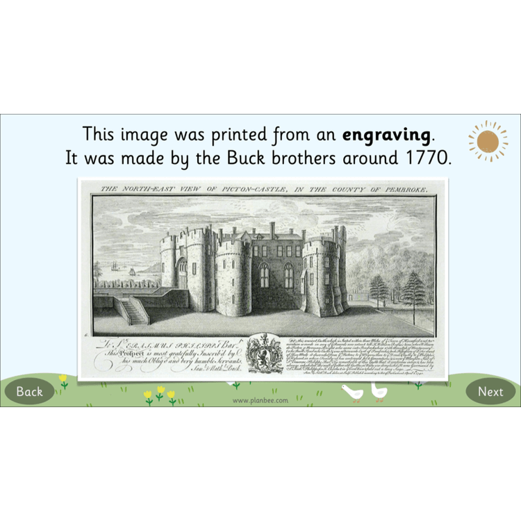 During this Art lesson your class will examine castle engravings. They will explore the work of the Buck brothers, looking closely at some of their famous engravings, including Picton Castle.