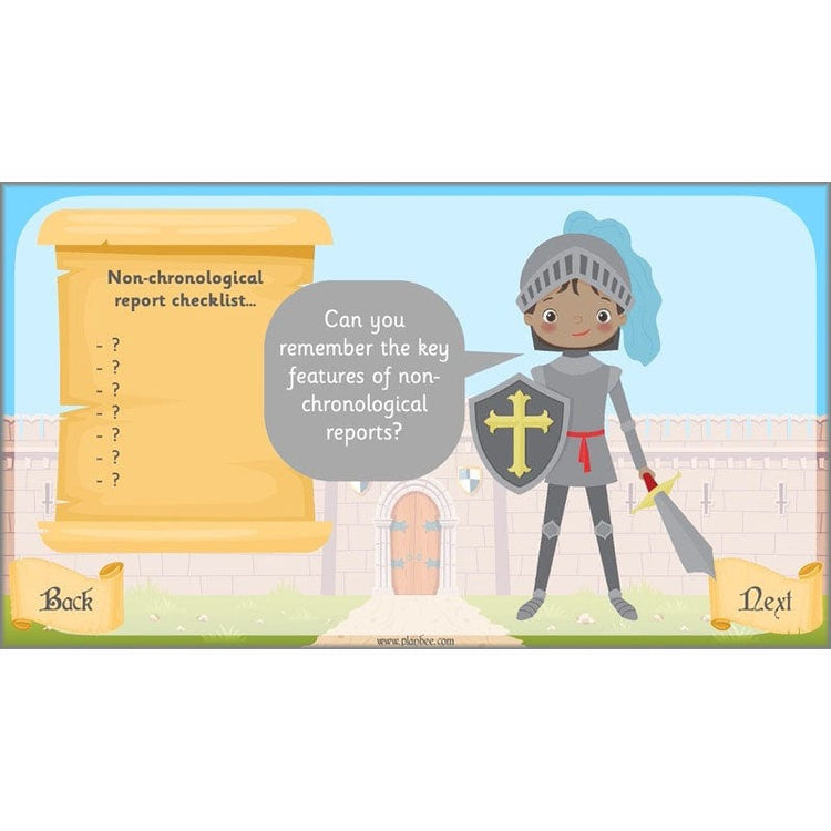 Using the interactive slideshow that comes as part of the pack, children will then choose which of seven castle doors to go through! Each door leads to a different key feature of non-chronological reports. A high-quality model text is used to demonstrate each of the key features and questions posed by the medieval characters on the slides encourage children to think about why each feature is useful to the reader. In the main activity, children will use their learning to identify and explain the features in another model text about the people who lived and worked in a castle. At the end of the lesson, children are shown a non-chrobological report without many key features and work with their partner to explain what is missing and why these features would help the reader.