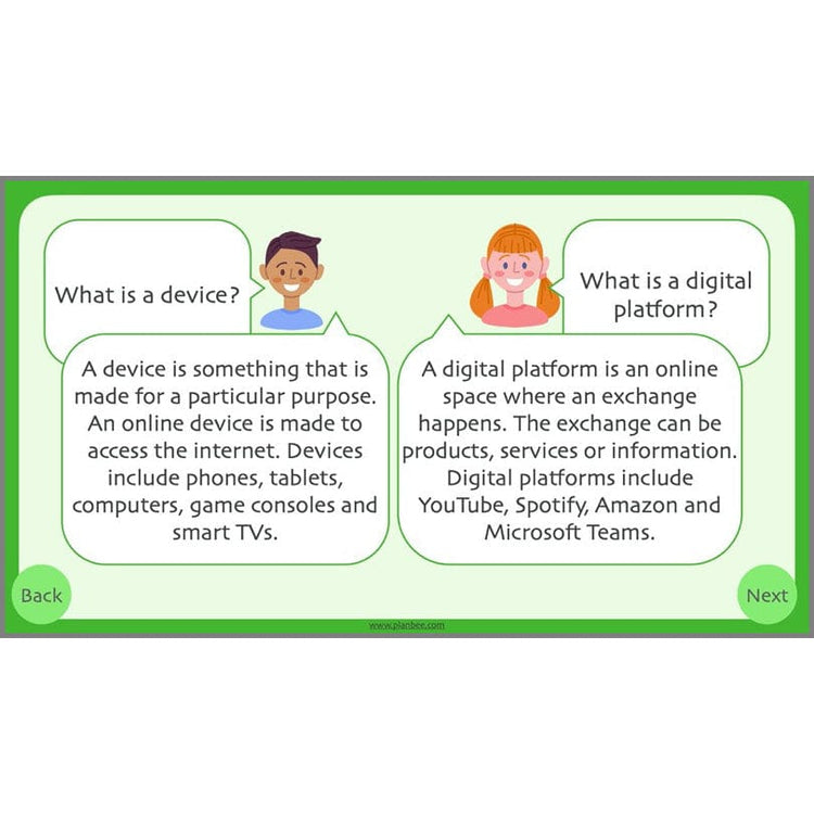 Children will think critically about the time they spend online to gain insight into their internet use. They will think about screen and screen-free time, online and offline time, and the devices and platforms they use. Children will be encouraged to think about the positives and negatives of being online while thinking about screen use in general.