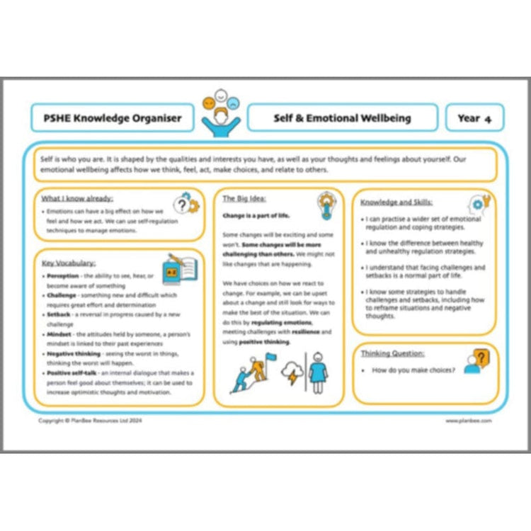 This Year 4 PSHE Knowledge Organiser has been created to complement our PSHE Self and Emotional Wellbeing strand. It is designed to support your children’s understanding of key vocabulary linked to this scheme of work. A thinking question and a big idea have been included to encourage your children to think deeply about this topic.