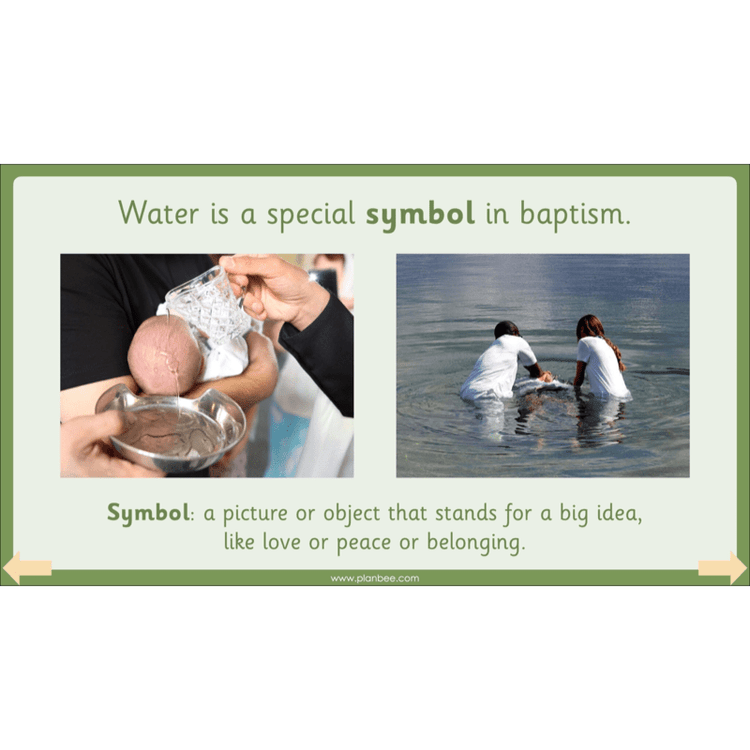 This Baptism KS1 lesson explains to children what a baptism is and why it is a Christian rite of passage. Your class will learn about how Christian children are baptised, going on to read the story of Jesus' baptism. They will also learn about some of the symbols and objects associated with Christian baptism.