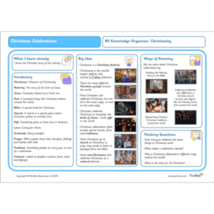 This Year 2 RE Knowledge Organiser has been created to complement the study of the Christianity strand within our RE and worldviews resource offer. It is designed to support your children's understanding of key vocabulary and big ideas covered in this scheme of work, while signposting prior learning. Children are also encouraged to reflect on 'Ways of Knowing' about religion and worldviews, and to think deeply about the topic through the 'Thinking Questions' provided.