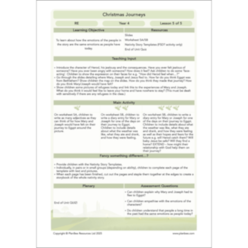 These informative and empathetic lessons take a fresh look at this familiar story as your class delve deeper into the emotions of the characters. With five detailed lesson plans, slides for each teaching input, differentiated activity ideas, printable resources (such as worksheets, picture cards and challenges) and an End of Unit Quiz, this Christmas Journeys KS2 planning pack is sure to make this a shining star of an RE scheme of work in your classroom!
