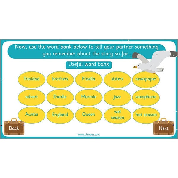 After recapping on what they can remember has happened so far in Coming to England by Floella Benjamin using a helpful vocabulary bank, children read the next part of the story. Drama is used to explore how Floella Benjamin felt as she boarded the boat to England.