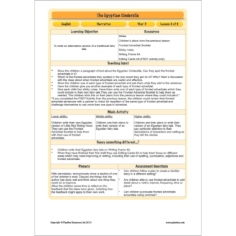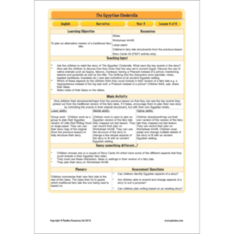 Perfectly linking English with your Ancient Egypt topic, this Egyptian Cinderella planning pack invites your Year 3 class to explore and retell fairy tales with an Egyptian twist! Using 'The Egyptian Cinderella' by Shirley Climo as inspiration, your pupils will compare this version of the classic story to the traditional Cinderella tale, spotting similarities and differences. They will then be challenged to plan and write their own imaginative Egyptian versions of well-known fairy tales, drawing on features from the model text and the ancient civilisation they’ve been learning about.