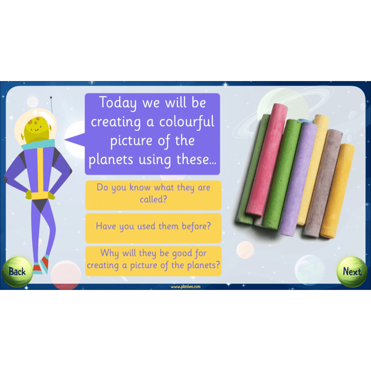 Everything needed to teach this Chalk Planets lesson is included within the pack: an engaging PDF slideshow featuring photographs of the step-by-step process children need to follow, a detailed plan with differentiated activities and all the printable resources required to make this lesson a success!