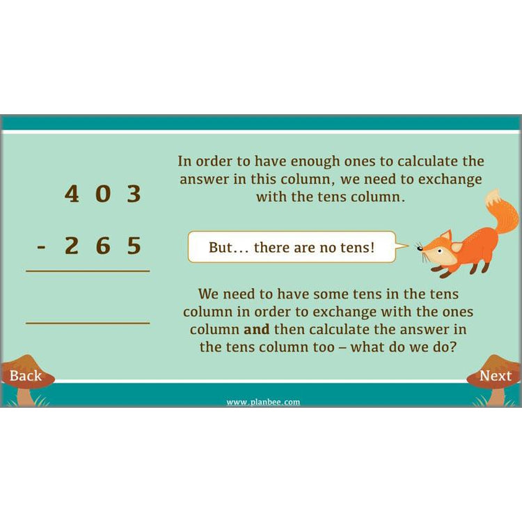 In this final lesson, focus is placed on the types of column subtractions which children often find tricky – those that involve one or more zeros in the larger number. They learn how to exchange across them in order to complete the calculation. In their independent activities, children choose and solve subtractions of varying levels of difficulty. Alternatively, in groups, they race to solve as many column subtractions as they can with the aim of accumulating the most points according to a given scoring system.