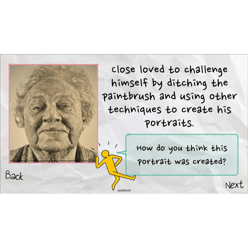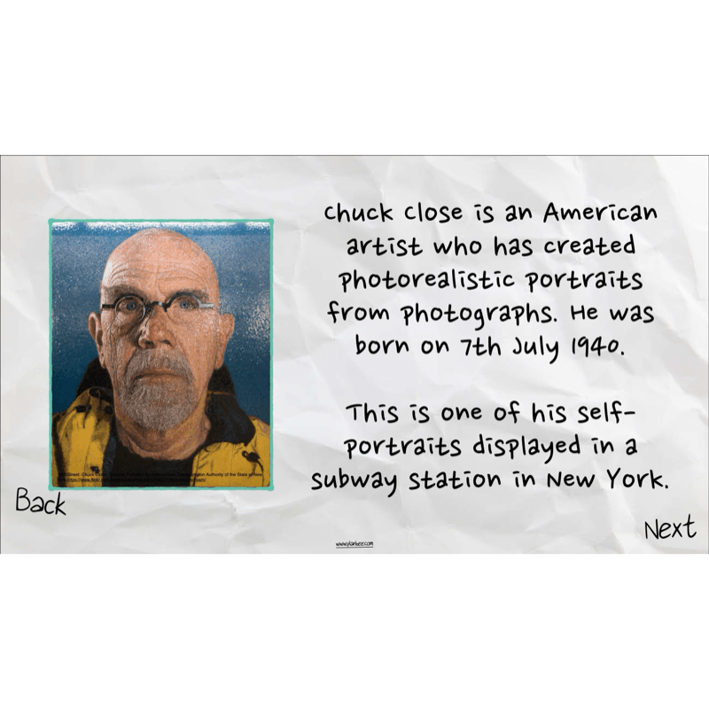 Explore the work of the modern artist Chuck Close, who has many different techniques to create his artwork. Look closely at the huge pieces he created using his fingerprint to make the lines and tones. Allow the children to reflect on his techniques and imitate them in their own self-portrait using fingerprints as their own unique tool.