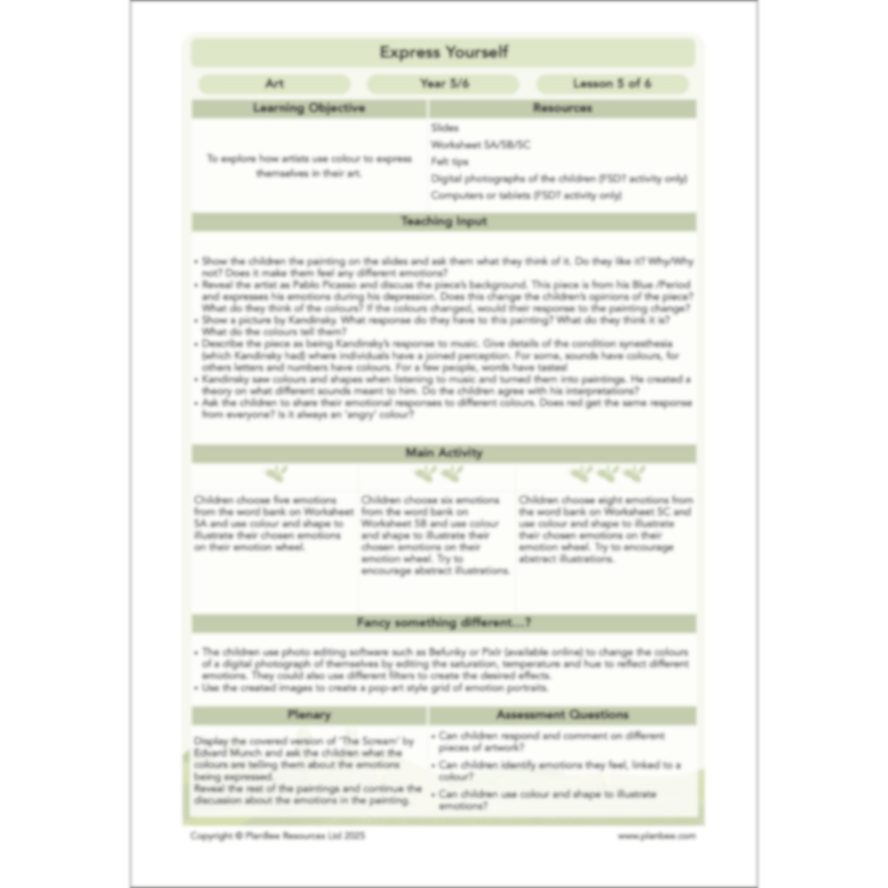 Explore the artistic world of self-expression in this five-lesson Year 5/6 scheme of work. Discover how artists like Kandinsky, Picasso and Munch use different techniques to convey emotions and ideas in their work, all through a series of detailed, engaging lessons (with plans, slideshows, differentiated activities and a range of printable resources) to help your class develop their own artistic skills.