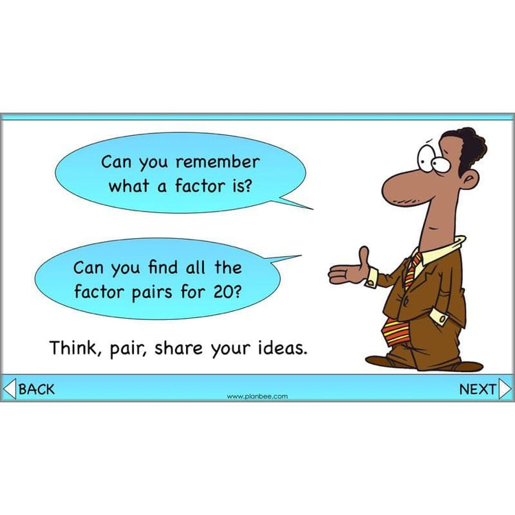 After recapping how to find factor pairs, your class will then learn how to identify common factors. The slides go through some examples of how to do this so children can get the hang of it before tackling their independent learning. Children will either sort factors in Venn diagrams to identify common factors, or play a fun board game that encourages them to find the greatest common factor. The plenary then brings them back together and challenges them to identify common multiples.