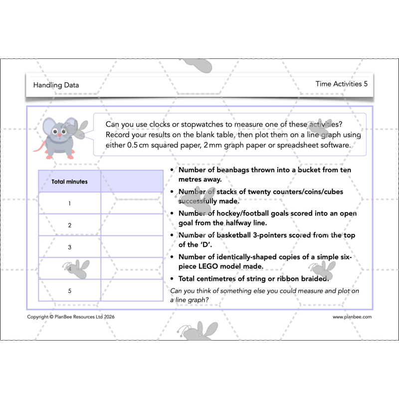 In this lesson, children will begin to consider how time data may be presented, and what types of graphs are most useful for presenting it. After that, they’ll learn how to plot simple sets of time data on line graphs, ensuring they understand first by writing their own graph-drawing instructions. After that there’s a choice of differentiated activities where children may either draw line graphs for given sets of data or collect and plot their own data.