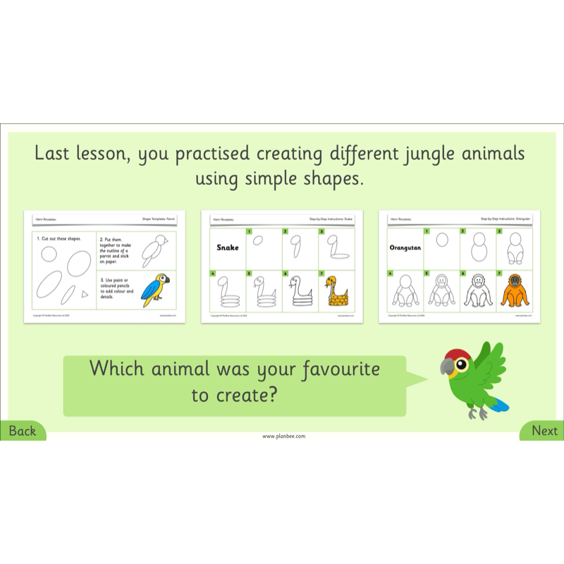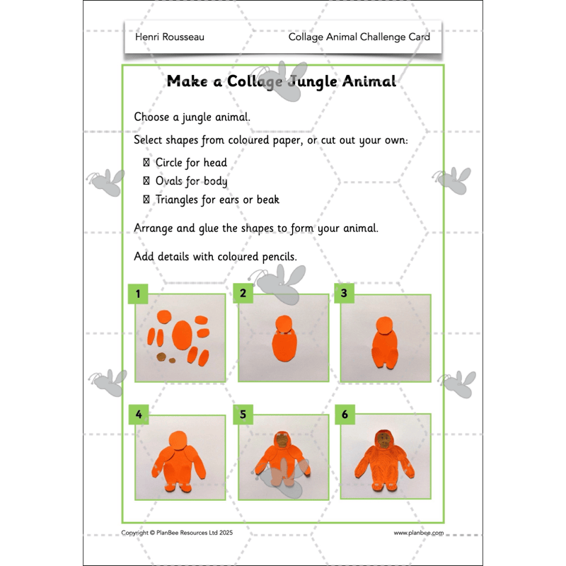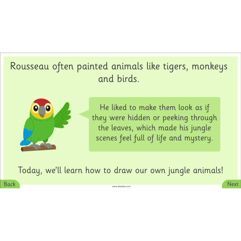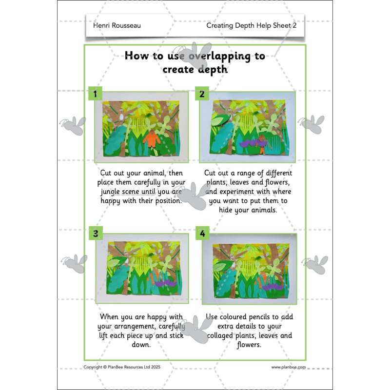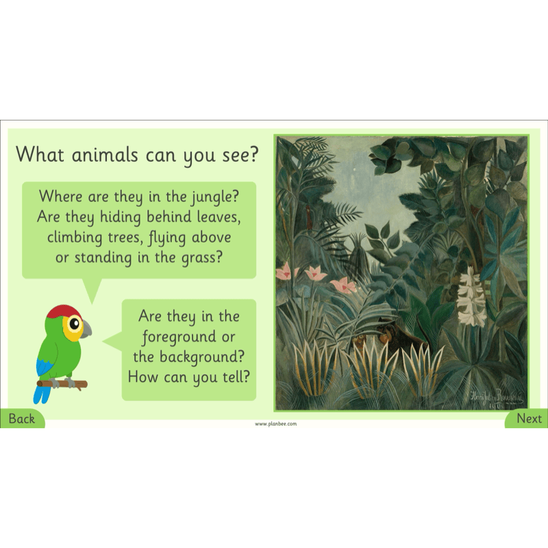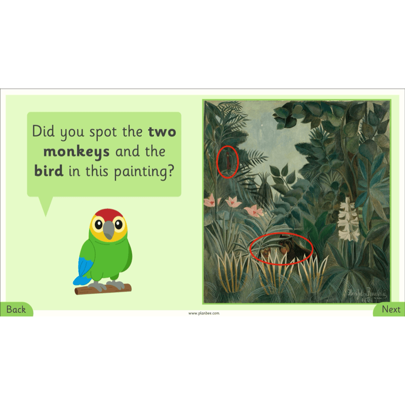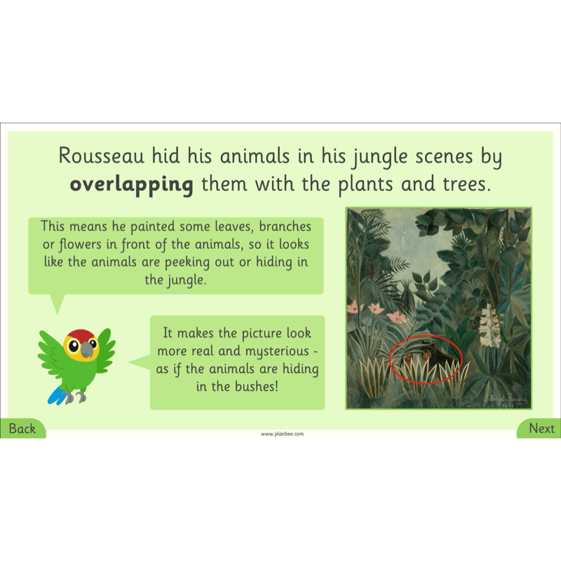 In this final lesson, children will explore how Rousseau hid animals in his jungle paintings by overlapping them with plants and trees.