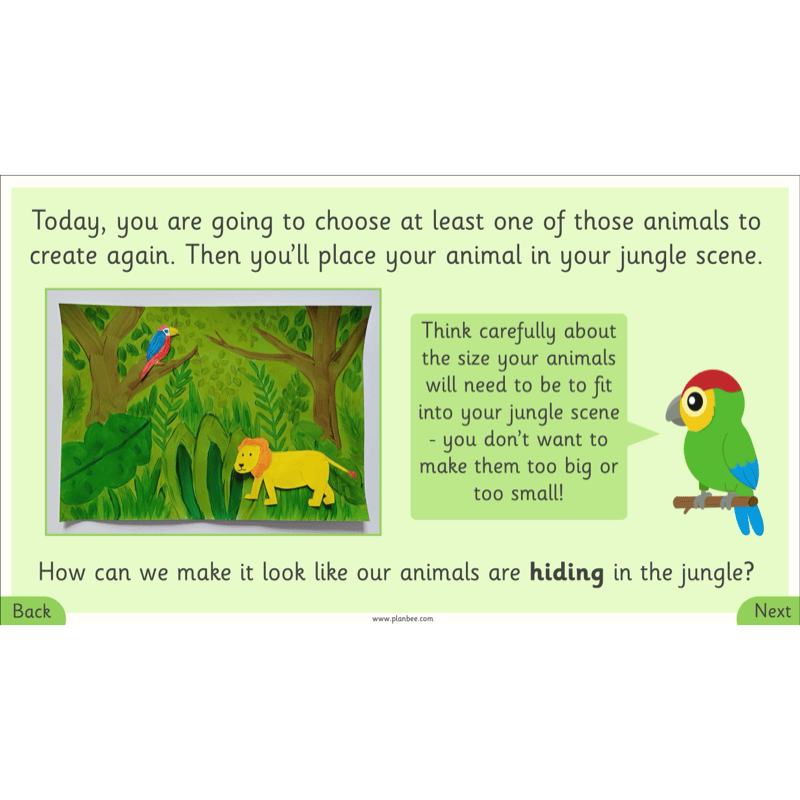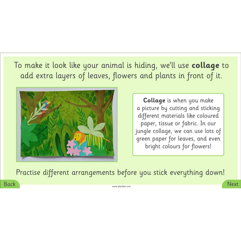 In their independent activities, they will create one or two animals, thinking carefully about size and placement, then use collage to add overlapping leaves and flowers to make the animals look partly hidden.