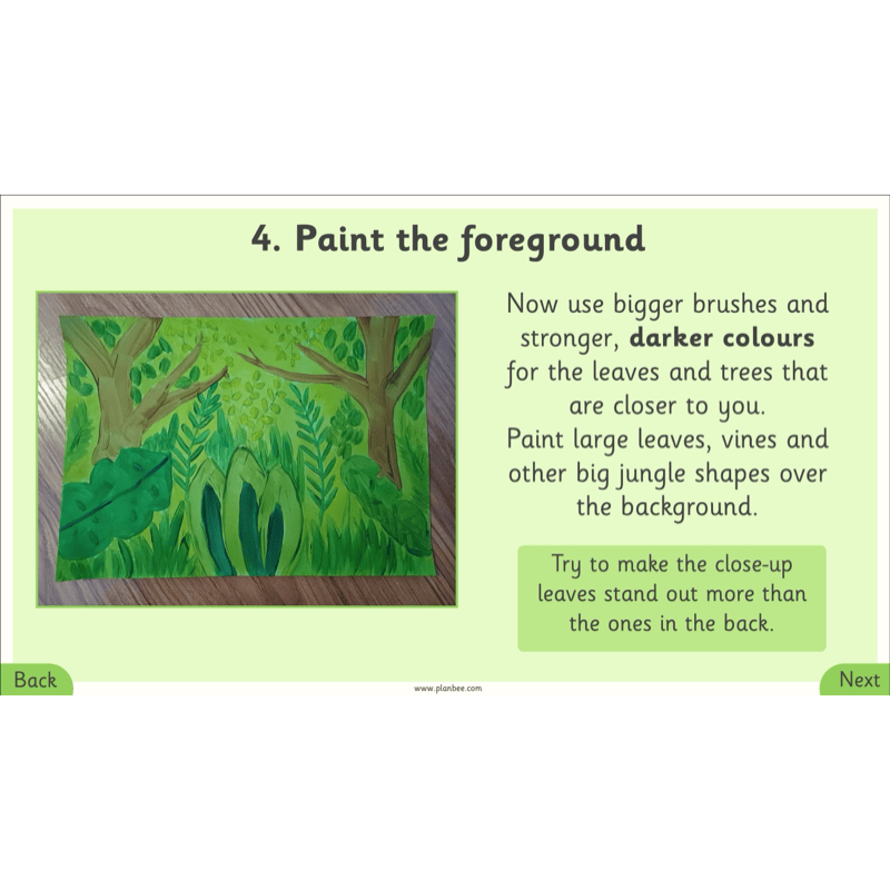Children will then sketch their own jungle scene, deciding on portrait or landscape layout, and paint lighter greens for the background and darker greens for the foreground. In the alternative activity, children create a jungle scene with depth using collage.