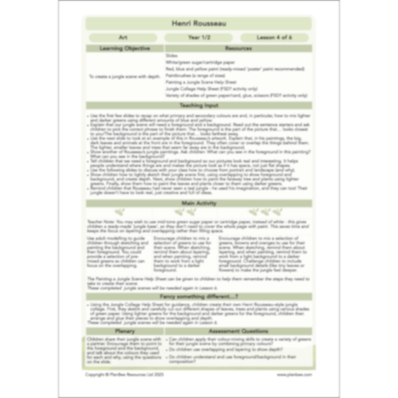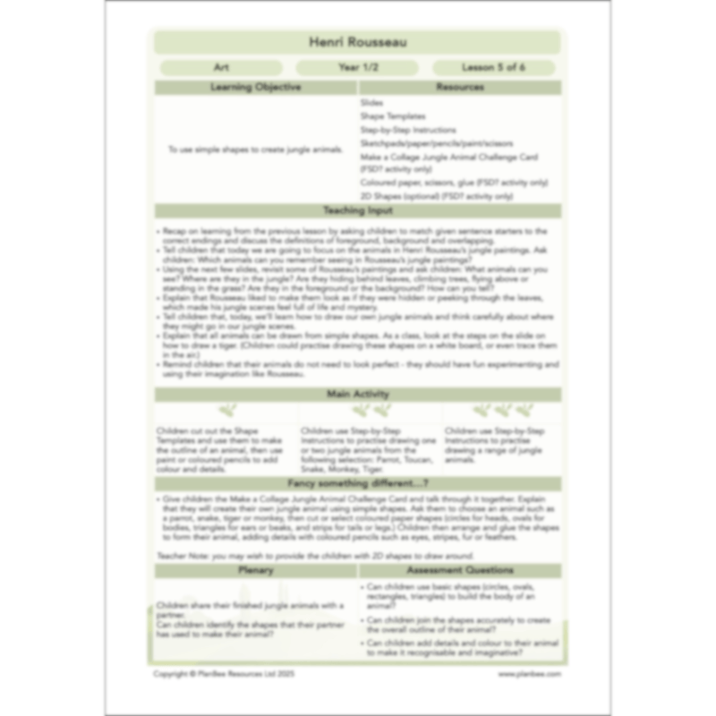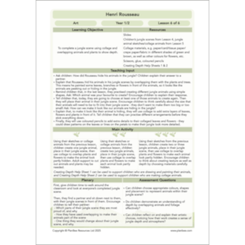 In this scheme, children will learn about the artist Henri Rousseau and explore the key features of his jungle-inspired artwork. They will develop their drawing skills by experimenting with line, shape and pattern, and learn how to mix primary colours to create the secondary colours needed for a vibrant jungle scene. Throughout the unit, children will build an understanding of depth by arranging simple shapes to form animals and plants, before completing a final jungle composition using collage and overlapping elements to create a rich, layered effect.