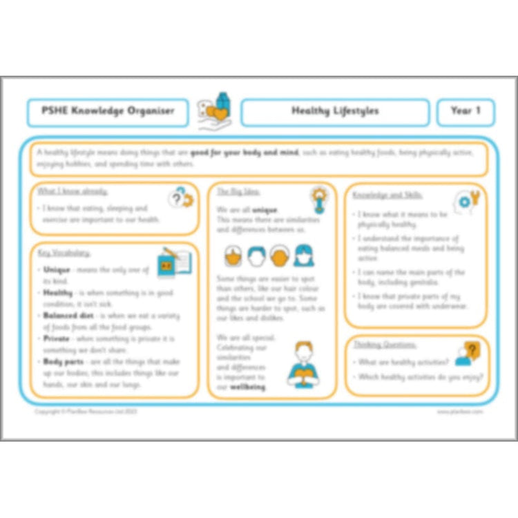 This Year 1 PSHE Knowledge Organiser has been created to complement our PSHE Healthy Lifestyles strand. It is designed to support your children’s understanding of key vocabulary linked to this scheme of work. A thinking question and a big idea have been included to encourage your children to think deeply about this topic.