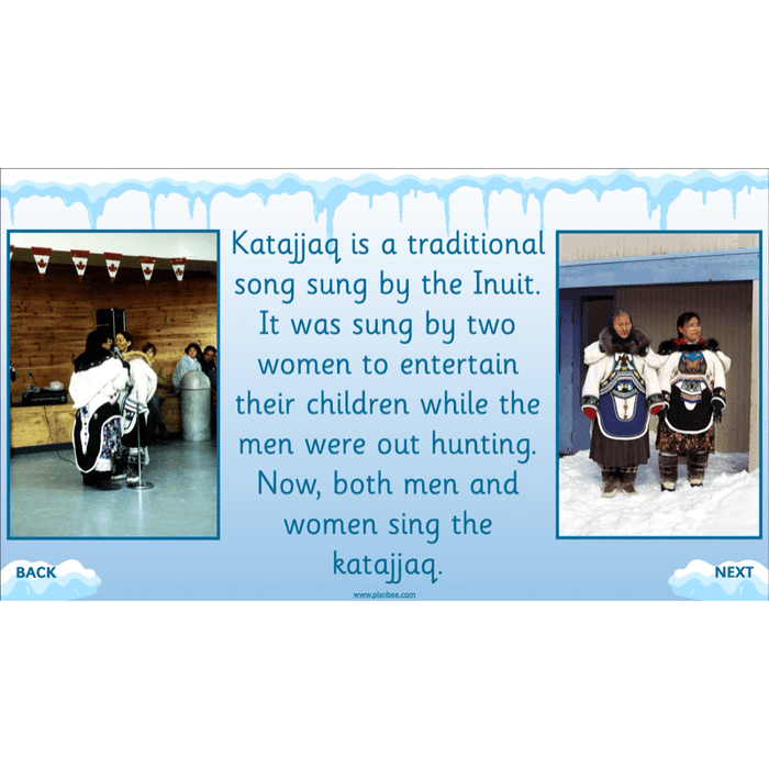 Enjoy the unique sound of the Inuit throat singing in this lesson as your class are introduced to this interesting and entertaining form of singing. Your class will love learning about the throat singing game Inuit women play and enjoy trying throat singing for themselves. They will also learn how to make sounds and echoes for Arctic objects and animals, working together in pairs to create a unique song.
