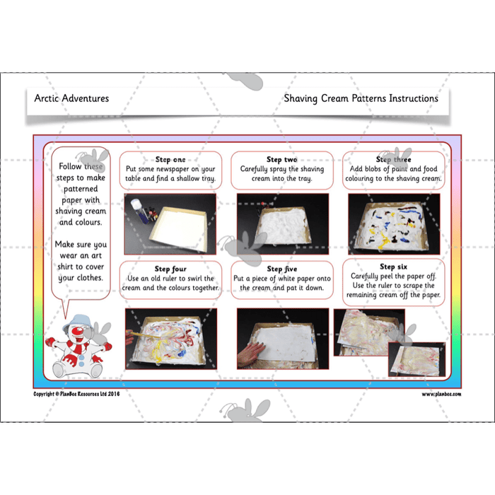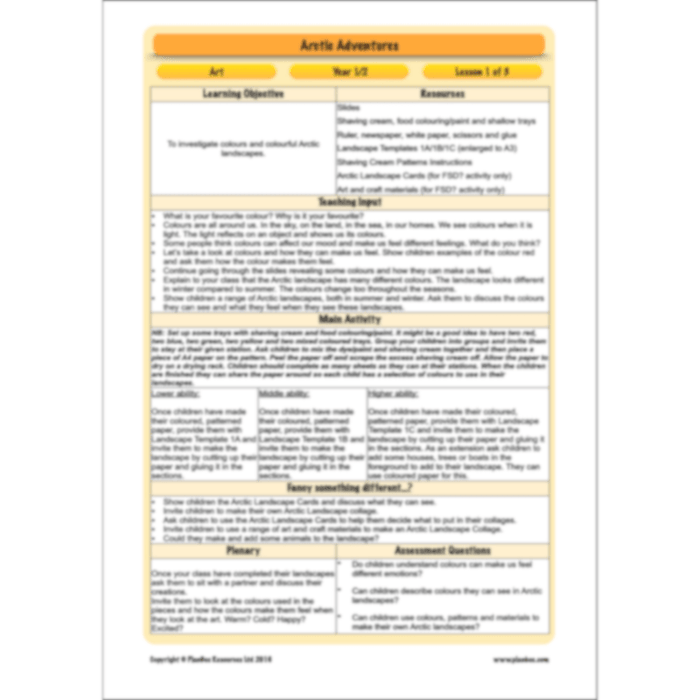 In this lesson, your class will explore Arctic landscapes in summer and winter and discuss the differences in colours between the two seasons. They will learn about colours and how they can make us feel, linking their ideas with the Arctic landscape. Your class will have fun making colourful marbled paper with shaving cream and paint to use in their very own Arctic landscapes.