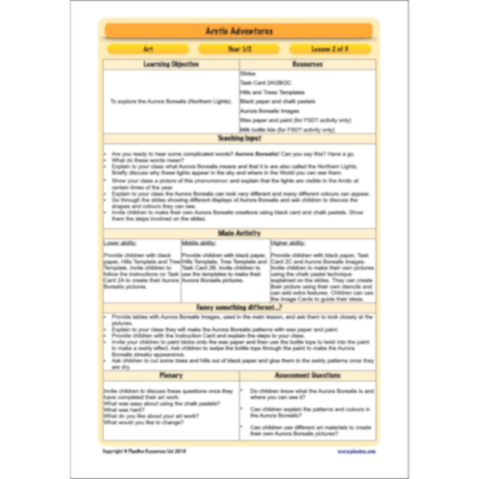 This Aurora Borealis Art Lesson Pack includes an easy-to-follow plan, a set of PDF slides for the teaching input, differentiated activity ideas and printable resources are all included in this downloadable pack.
