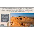 Now that your class knows that deserts are places that receive very little precipitation, this lesson gives them the chance to further explore and compare the various climates of deserts around the world. During the included slideshow presentation, children will learn about how temperatures vary from night to day and season to season, exploring some of the extreme temperatures found in deserts around the world.