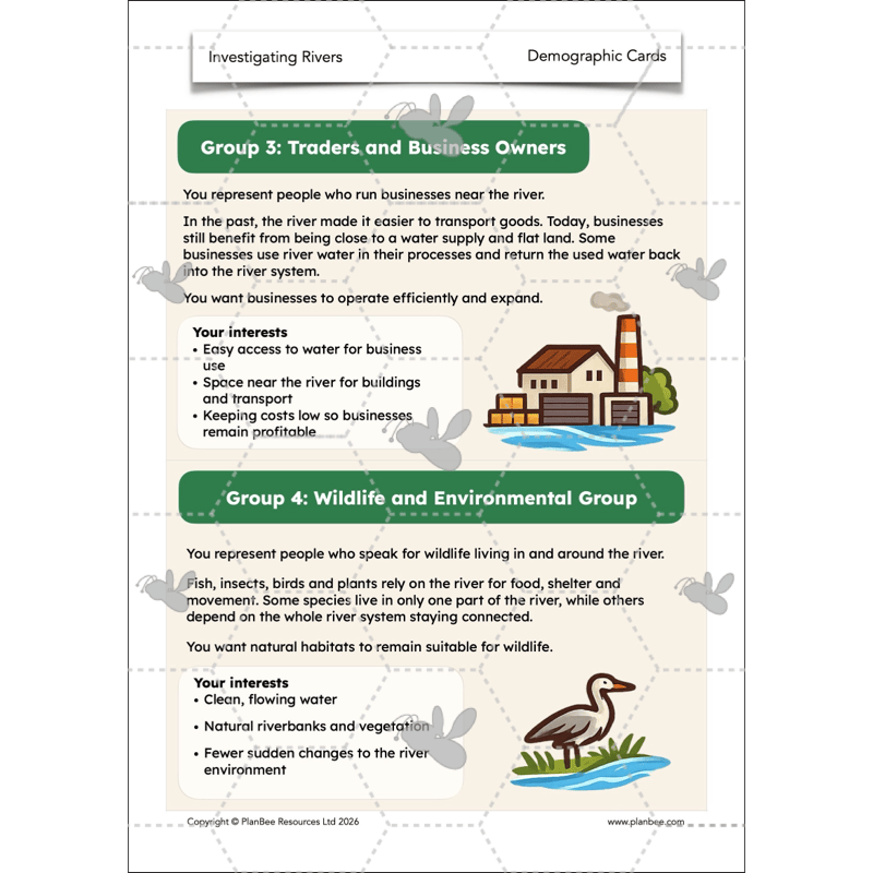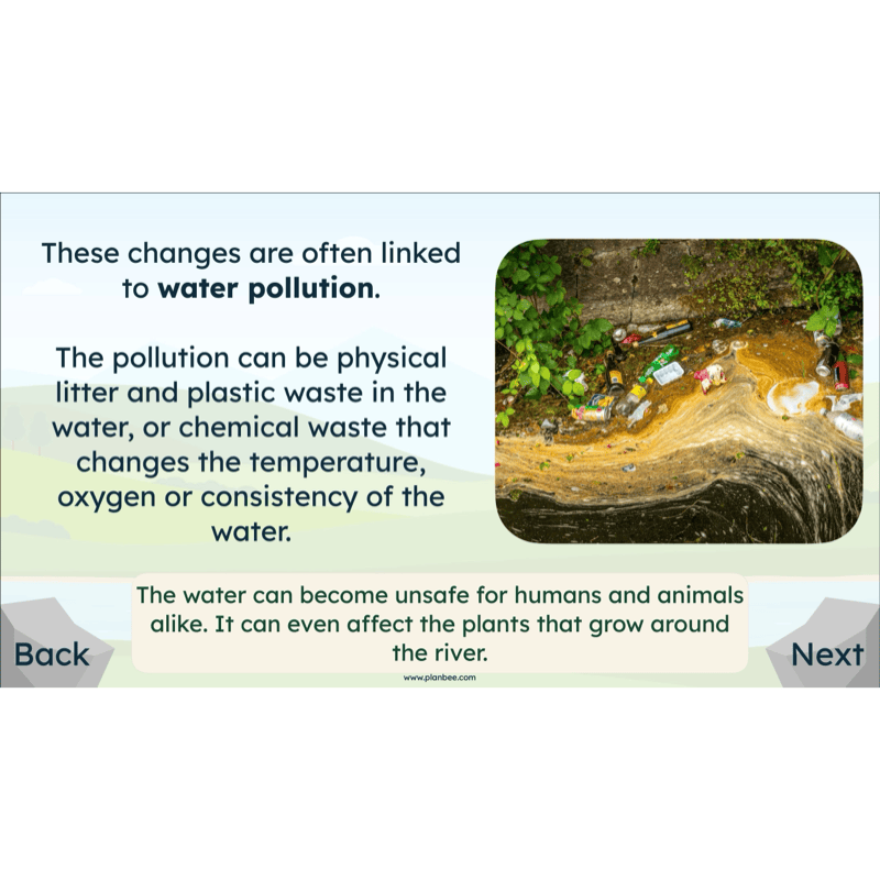 Children then consider how increased use of rivers can lead to changes in water quality, river flow and surrounding environments. They explore how different human activities can impact rivers and evaluate how rules and responsible use can help protect rivers for people, wildlife and future generations.