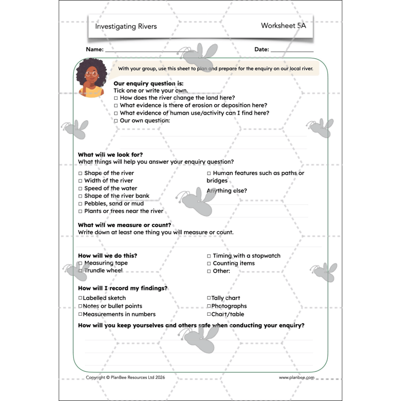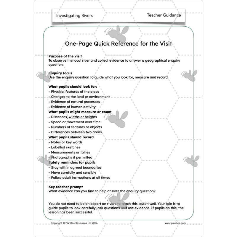 Take your class on a trip to your local river or stream to conduct their own geographical enquiry into the health or uses of the river. The children will use this lesson to plan and prepare for their enquiry in small groups or as a class. Using the supporting resources they will think carefully about what information they can gain from visiting the site of your local river and the different aspects that they may be able to measure.