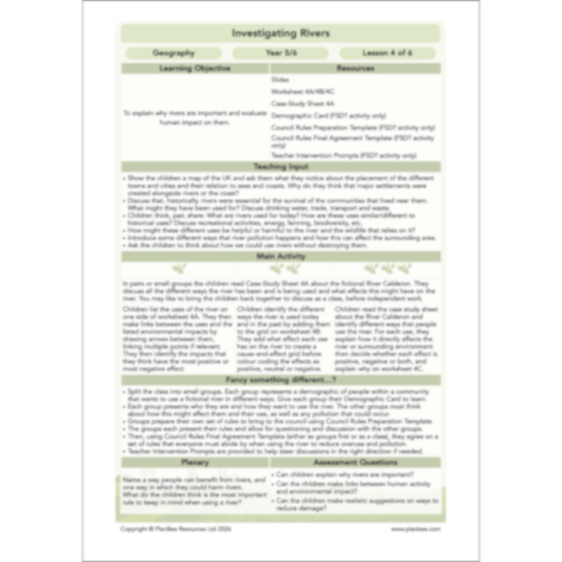 Make a splash with our Investigating Rivers scheme for Year 5/6! Packed with ready-to-teach lesson plans, engaging slides and printable resources, this unit takes children on a river’s journey from source to mouth, exploring how erosion, transportation and deposition shape the landscape. Pupils connect rivers to the water cycle, compare UK and world rivers, and consider how people use and manage these vital waterways. Clear, age-appropriate explanations, rich vocabulary and case-study prompts (including an accessible town-river scenario) help children see how rivers affect wildlife, settlements and everyday life, including what happens when rivers flood.