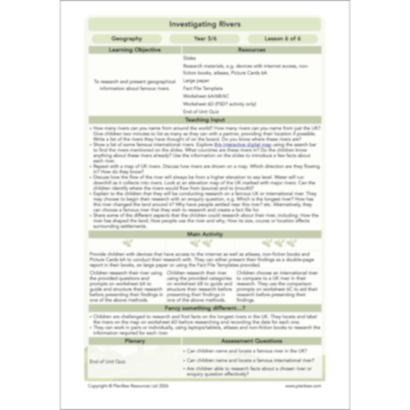 This final lesson challenges children to use their previous learning about rivers, their features and uses to research and create a fact file about their chosen river.