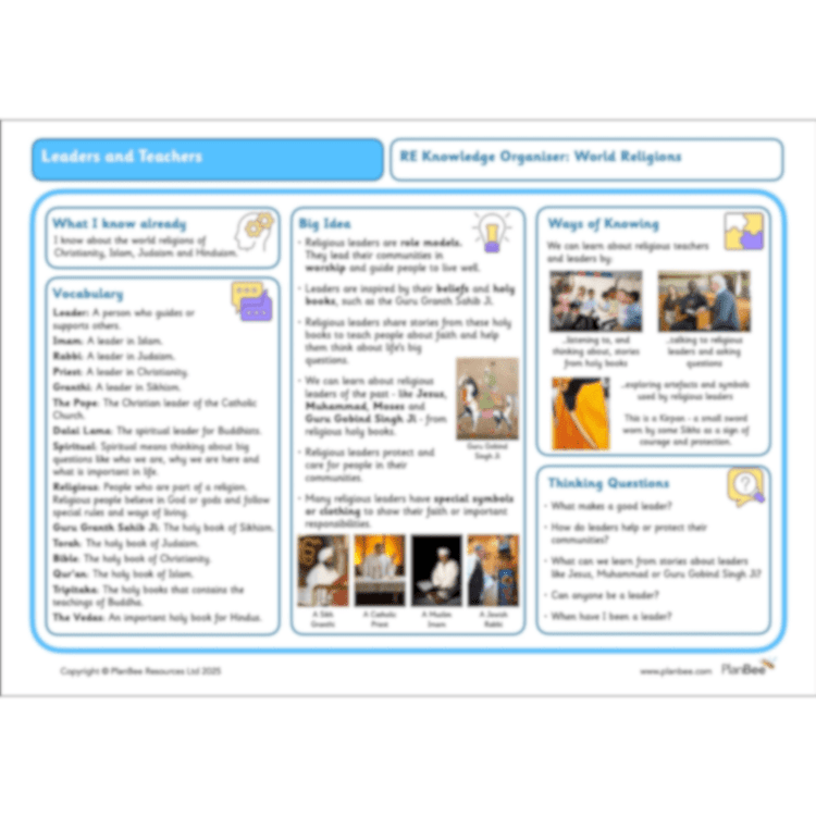 Each 'Leaders and Teachers' lesson includes everything you need to teach Key Stage 1 children about the role of religious leaders in communities, including detailed plans with clearly explained teacher input and a choice of learning activities for children, slides, differentiated worksheets, and other printable resources.