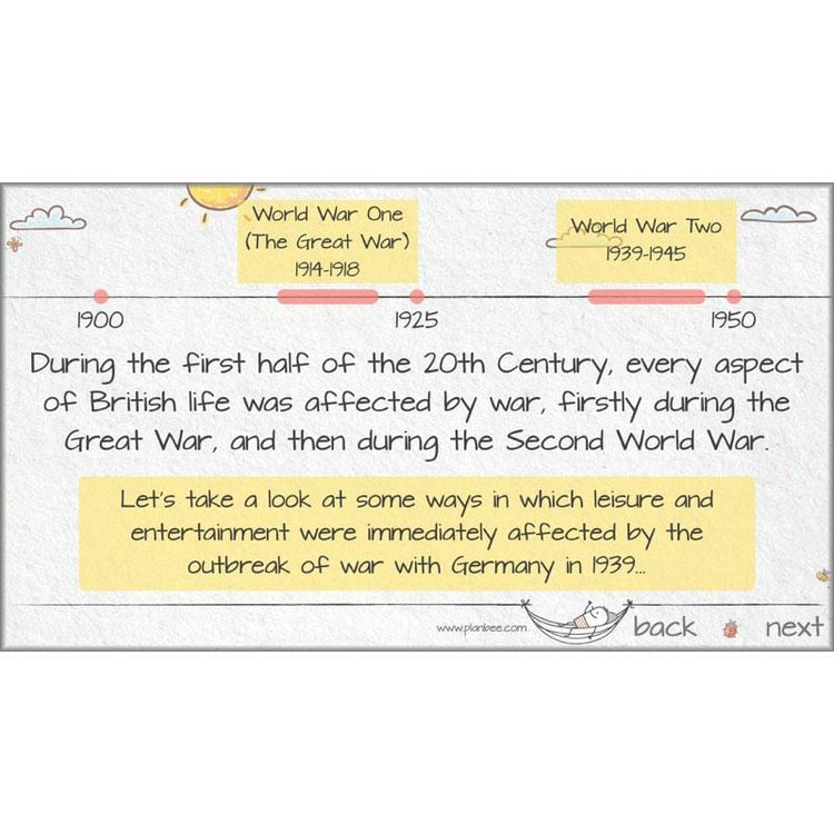 How were many popular British pastimes affected by the outbreak of war? The included slides explore this question and include a number of images and descriptions of many of the changes that affected daily life in Britain during the Second World War. Following this, challenge children to engage with one of two included learning activities where they will either: consider the causes and effects of changes to leisure and entertainment, or work in groups to become 'experts' on wartime pastimes.