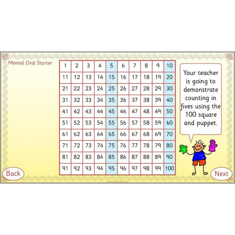 The fourth lesson in this series introduces your class to counting in fives in a variety of different ways, such as using a hundred square and puppet, and counting different objects that represent five. The children will enjoy a fun interactive game of counting in fives to find the missing number in order to stop the man from falling off the ladder! They can also have fun answering counting in fives questions to be the first to cross a river of crocodiles.